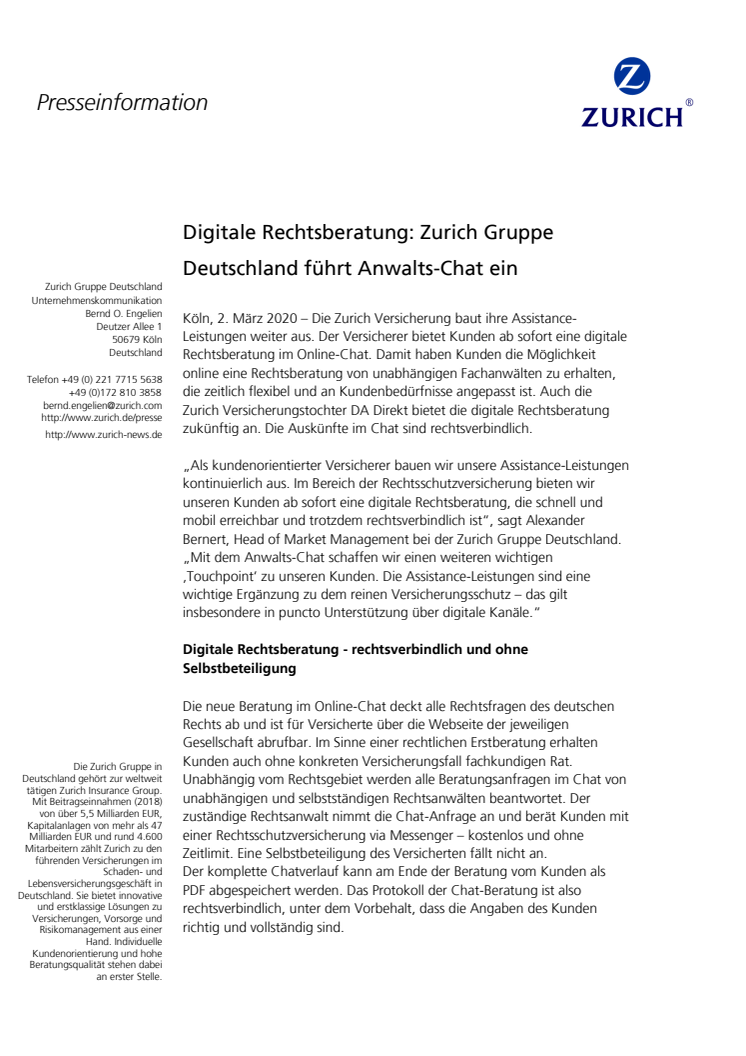 Digitale Rechtsberatung: Zurich Gruppe Deutschland führt Anwalts-Chat ein