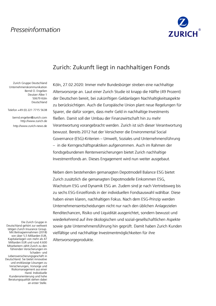 Zurich: Zukunft liegt in nachhaltigen Fonds
