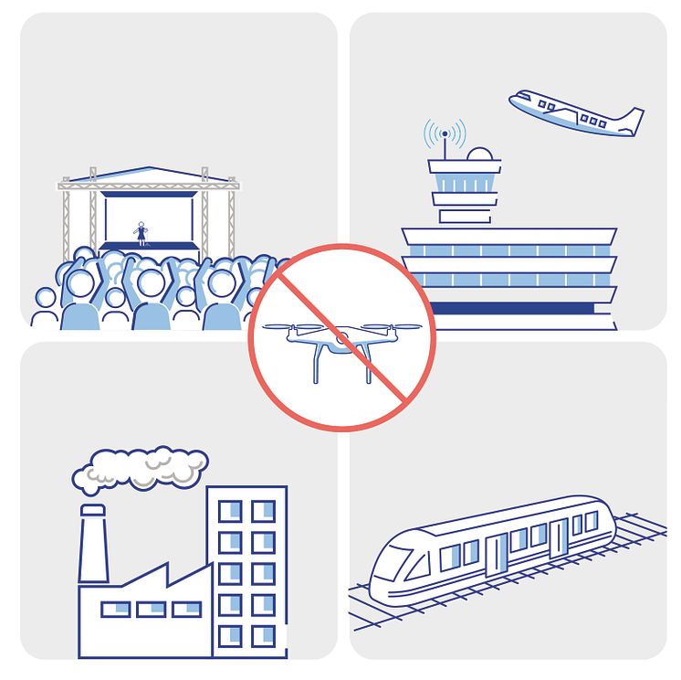 Es gibt sogenannte Flugverbotszonen für Drohnen: Zonen in denen man gar nicht fliegen darf – beispielsweise über Industrie- und Bahnanlagen, über Naturschutzgebieten oder in der Nähe von Flugplätzen. Wichtig: Auch über Menschenansammlungen dürfen Drohnen nicht fliegen.