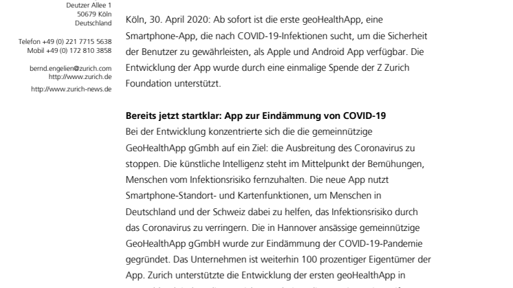 Köln, 30. April 2020: Ab sofort ist die erste geoHealthApp, eine Smartphone-App, die nach COVID-19-Infektionen sucht, um die Sicherheit der Benutzer zu gewährleisten, als Apple und Android App verfügbar. Die Entwicklung der App wurde durch eine einmalige Spende der Z Zurich Foundation unterstützt.