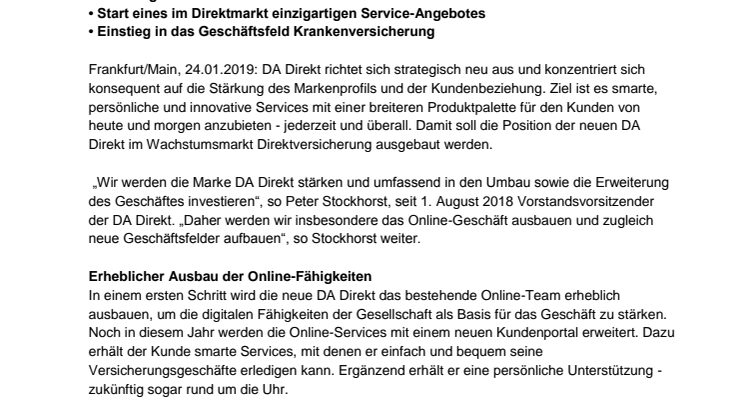 „Wir werden die Marke DA Direkt stärken und umfassend in den Umbau sowie die Erweiterung des Geschäftes investieren“, so Peter Stockhorst, seit 1. August 2018 Vorstandsvorsitzender der DA Direkt. „Daher werden wir insbesondere das Online-Geschäft ausbauen und zugleich neue Geschäftsfelder aufbauen“, so Stockhorst weiter.