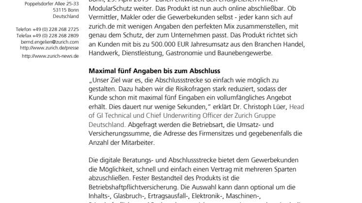 Bonn, 29. April 2019 – Zurich entwickelt den erfolgreichen Firmen ModularSchutz weiter. Das Produkt ist nun auch online abschließbar. Ob Vermittler, Makler oder die Gewerbekunden selbst - jeder kann sich auf zurich.de mit wenigen Angaben den perfekten Mix zusammenstellen, mit genau dem Schutz, der zum Unternehmen passt. Das Produkt richtet sich an Kunden mit bis zu 500.000 EUR Jahresumsatz aus den Branchen Handel, Handwerk, Dienstleistung, Gastronomie und Baunebengewerbe.