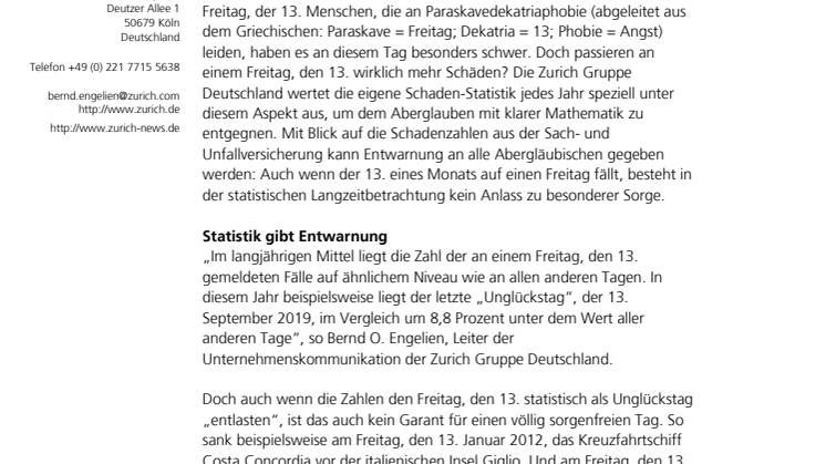 Köln, 12. Dezember 2019: Im Volksglauben gilt er gemeinhin als Unglückstag, der Freitag, der 13. Menschen, die an Paraskavedekatriaphobie (abgeleitet aus dem Griechischen: Paraskave = Freitag; Dekatria = 13; Phobie = Angst) leiden, haben es an diesem Tag besonders schwer. Doch passieren an einem Freitag, den 13. wirklich mehr Schäden? Die Zurich Gruppe Deutschland wertet die eigene Schaden-Statistik jedes Jahr speziell unter diesem Aspekt aus, um dem Aberglauben mit klarer Mathematik zu entgegnen. Mit Blick auf die Schadenzahlen aus der Sach- und Unfallversicherung kann Entwarnung an alle Abergläubischen gegeben werden: Auch wenn der 13. eines Monats auf einen Freitag fällt besteht in der statistischen Langzeitbetrachtung kein Anlass zu besonderer Sorge.