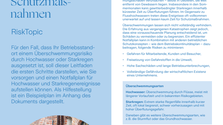 Betriebe erhalten durch den Leitfaden eine Hilfestellung zur Bewertung des Überschwemmungsrisikos und werden über Ad-hoc-Maßnahmen zur Risikominimierung informiert. Zusätzlich gibt es eine Anleitung für die Erstellung eines Notfallplans. Technische und bauliche Maßnahmen zu Gebäudeschutz, Lagerung und Entwässerung sind ebenso Thema wie organisatorische Maßnahmen wie Datensicherung, Behördenkontakte oder Sensibilisierung der Mitarbeiterschaft.