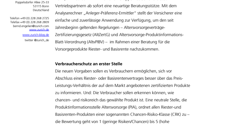Die neuen Vorgaben sollen es Verbrauchern ermöglichen, sich vor Abschluss eines Riester- oder Basisrentenvertrages besser über das Preis-Leistungs-Verhältnis der auf dem Markt angebotenen zertifizierten Produkte zu informieren. Und: Die Verbraucher sollen erkennen können, wie chancen- und risikoreich das gewählte Produkt ist. Eine neutrale Stelle, die Produktinformationsstelle Altersvorsorge (PIA), ordnet allen Riester-und Basisrenten-Produkten einer sogenannten Chancen-Risiko-Klasse (CRK) zu – die Bewertung geht von 1 (geringe Risiken/Chancen) bis 5 (hohe Risiken/Chancen). Diese wird von den Anbietern auf den Produktinformationsblättern angegeben. Damit soll sichergestellt werden, dass Kunden vor dem Abschluss einer Riester- oder Basisrente über die Chancen-Risiken des Produktes aufgeklärt werden. Zurich geht nun einen Schritt weiter und legt mithilfe des Anleger-Präferenz-Ermittlers in der Beratung auch die Risikoneigung des Kunden fest. Denn mehr sicherheitsorientierten Kunden sollten eher Produkte der CRK 1 und 2 und chancenorientierten Kunden CRKs zwischen 3 und 5 angeboten werden.