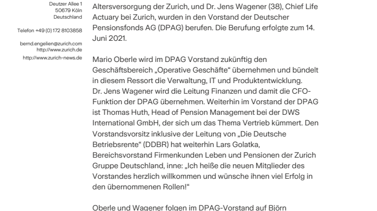 Oberle und Wagener folgen im DPAG-Vorstand auf Björn Bohnhoff, weiterhin Vorstand Leben der Zurich Gruppe Deutschland, sowie Dr. Michael Leinwand, der das Unternehmen verlassen hat. Die Deutsche Pensionsfons AG ist ein Joint-Venture von Zurich und der DWS Gruppe. Die DPAG ist einer der führenden und innovativsten offenen Pensionsfonds in Deutschland und steht mit seiner Expertise für die Übernahme von Pensionsverpflichtungen allen Vertriebswegen und Kundengruppen offen.