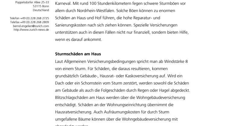 Bonn, 4. März 2019 Das Sturmtief Bennet feiert heute seinen eigenen Karneval. Mit rund 100 Stundenkilometern fegen schwere Sturmböen vor allem durch Nordrhein-Westfalen. Solche Böen können zu enormen Schäden an Haus und Hof führen, die hohe Reparatur- und Sanierungskosten nach sich ziehen können. Spezielle Versicherungen unterstützen auch in diesen Fällen nicht nur finanziell, sondern bieten Hilfe, wenn es darauf ankommt.