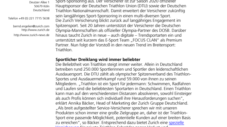 Die Zurich Versicherung blickt zurück auf langjähriges Engagement im Spitzensport. Seit 20 Jahren unterstützt der Versicherer die Deutschen Olympia-Mannschaften als offizieller Olympia-Partner des DOSB. Darüber hinaus taucht Zurich in neue – auch digitale – Trendsportarten ein und unterstützt seit kurzem das E-Sport Team „FOCUS CLAN“ als Premium Partner. Nun folgt der Vorstoß in den neuen Trend im Breitensport: Triathlon.